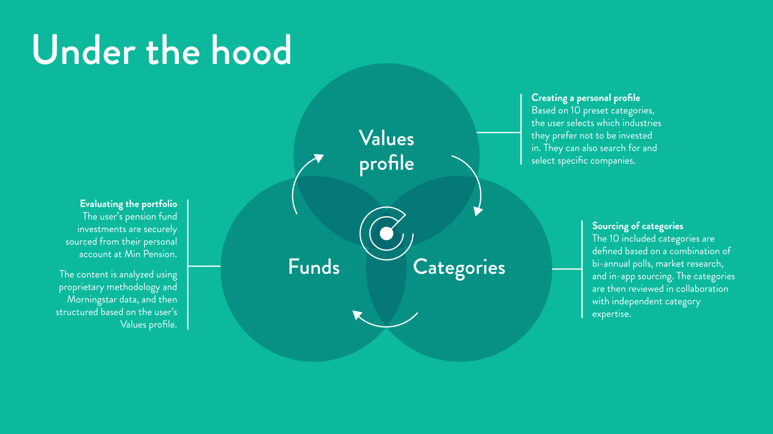 The platform combined secure pension data, Morningstar fund data, a proprietary categorization framework, and ownership tracing up to five layers deep. Users could define exclusion criteria, scan their funds, and identify exposure conflicts across institutional layers.